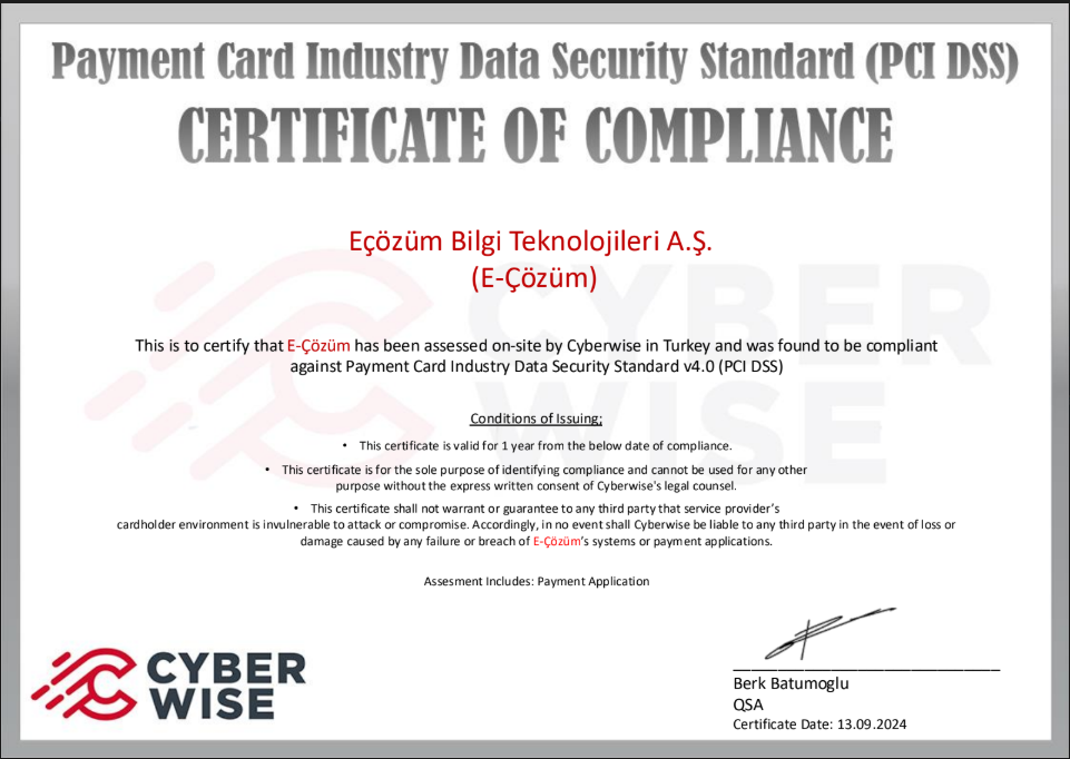 Kredi kartı bilgilerinin güvenliği için TLS ECC 256 bit sertifika ve AES 256 Bit key kullanılmakta, ödeme ve tahsilat işlemleri 3D secure özelliği ile güvenli bir şekilde gerçekleştirilebilmektedir. Yazılımların çalıştığı donanımlar 3 katmanlı güvenlik sistemleriyle korunmakta ve 3 katmanlı yedekleme yapılmaktadır.
